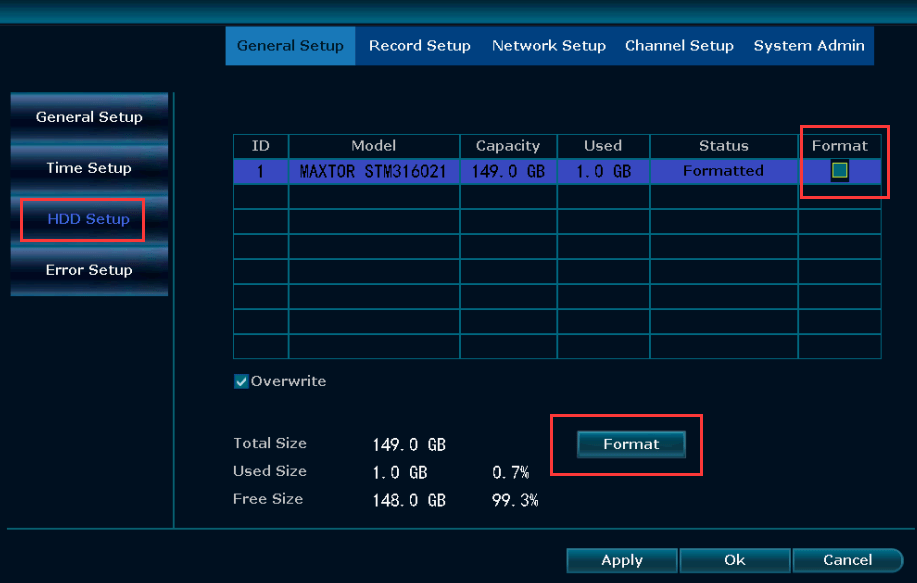 Step4. Turn on the NVR and check if it detects theĀ hardĀ drive.System setup—>General setup—>HDD setup,