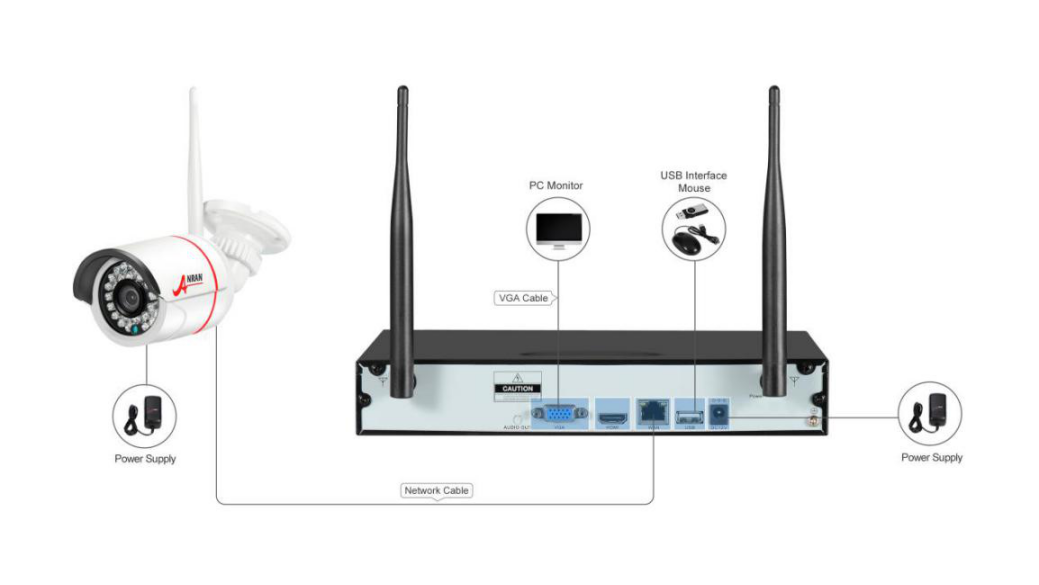 Install antennas for cameras and take it close to the NVR; Then plug the camera to power adapter and use a network cable to connect the camera to NVR’s LAN port.
